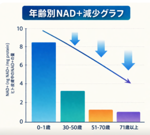この「NAD+」こそが、細胞のエネルギーを生み出し、若々しさを保つための必須成分なのです。 しかし、このNAD+は20代をピークに減少し始め、40代になるとピーク時の約半分にまで激減してしまいます。